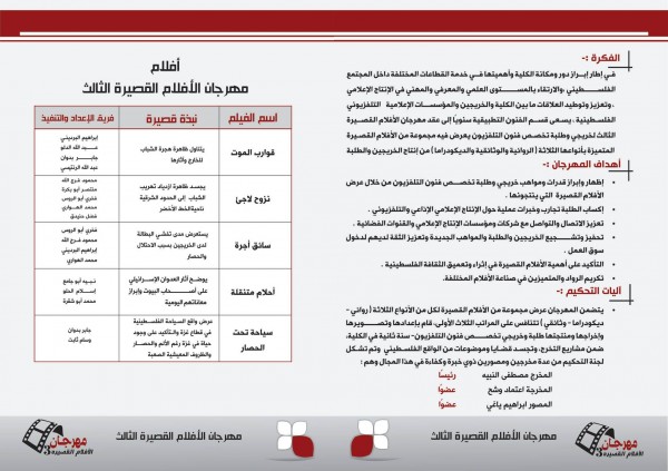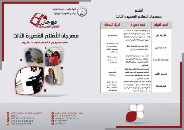 أعلن د. نعيم المصري رئيس اللجنة التحضيرية لمهرجان الأفلام القصيرة الثالث لخريجي وطلبة تخصص فنون التلفزيون بكلية فلسطين التقنية أن الكلية أنهت استعداداتها وكافة التجهيزات والترتيبات اللازمة لعقد المهرجان يوم الأربعاء القادم بقاعة الاجتماعات الكبرى داخل مقر الكلية .
