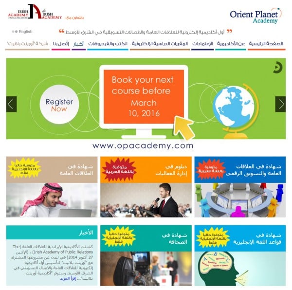 وتعد "أكاديمية أورينت بلانيت"، التي تأسست في العام 2014، مشروعاً مشتركاً بين "أورينت بلانيت" (Orient Planet)، إحدى أهم وأسرع شركات العلاقات العامة والاتصالات التسويقية نمواً في منطقة الشرق الأوسط، و"الأكاديمية الإيرلندية للعلاقات العامة" (Irish Academy)، وهي مؤسسة دولية مرموقة في إيرلندا تُعنى بتزويد خدمات التعليم الإلكتروني في مختلف المجالات المتعلقة بالاتصالات التسويقية. وتوفر "أكاديمية أورينت بلانيت" دورات تدريبية عالية المستوى، تمّ تصميمها وتطويرها خصيصاً من قبل "الأكاديمية الإيرلندية للعلاقات العامة" في سبيل تلبية احتياجات وتطلعات الكفاءات البشرية في العالم العربي. ويمكن زيارة الموقع الإلكتروني (www.opacademy.com) للإطلاع على تفاصيل الدورات التدريبية المقامة بإشراف نخبة المدرّبين الناطقين باللغتين العربية والإنجليزية."