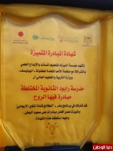 الوزارة ومدير مؤسسة النيزك دور المهندس عارف الحسيني ومدراء مديريات التربية والتعليم، احتفل يوم أمس الثلاثاء الموافق 23/2/2016 م في قصر المؤتمرات - بيت لحم بتكريم المدارس المتميزة على مستوى الوطن ضمن برنامج بادر( 2) – مؤسسة النيزك وكان من ضمن المدارس المتميزة التي تم تكريمها : مدرسة رابود الثانوية المختلطة عن مبادرة ( فيها الروح ) التي تسلط الضوء على المخزون الأثري للقرية ، ممثلة بمدير المدرسة القائد التربوي الأستاذ فيصل اقطيط ومنسق المبادرة الأستاذ رياض اقطيط ولجنة المبادرة من طلبة الصف الثامن وقد عبر الطلبة عن سرورهم الشديد لفوز مبادرتهم على مستوى الوطن وإشادة وزير التربية بموضوع مبادرتهم بشكل محدد في كلمته التي ألقاها في الاحتفال وتوجهوا بالشكر لمدير المدرسة ومنسق البرنامج ولفريق النيزك ومنسقة البرنامج في المديرية المشرفة فلسطين الخطيب وكل من ساهم في نجاح المبادرة من أسرة المدرسة ومجتمع محلي ومؤسسات وخاصة مديرية السياحة والآثار في محافظة الخليل ممثلة بمديرها العام الدكتور أحمد رجوب ومجلس الخدمات المشترك – ريف دورا.