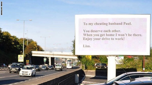 واستأجرت امرأة تدعى «ليزا» لوحة إعلانية ضخمة لمدة 3 ساعات في أزحم شوارع مدينة شيفيلد البريطانية، والذي يمر منه معظم الناس إلى منطقة نصف المدينة، حسب موقع CNN الأمريكي، لتوجه رسالة لزوجها قائلة: «إلى زوجي الخائن بول: أنتما تستحقان بعضكما، لن تجدني بالمنزل لدى عودتك، استمتع بقيادتك للسيارة إلى عملك.. ليزا».