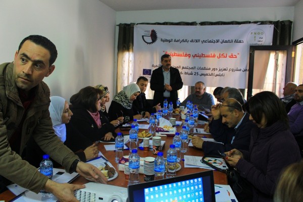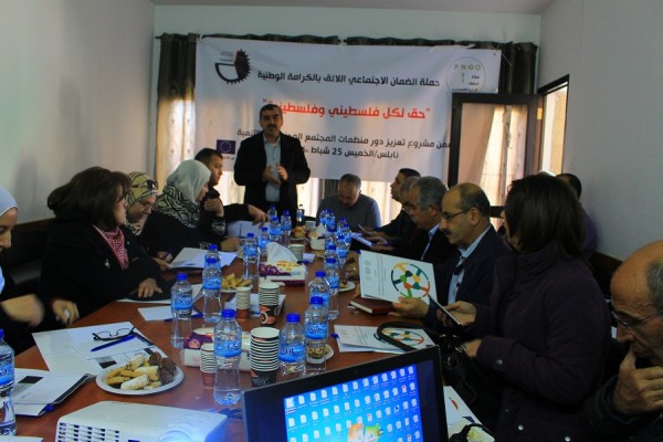نظمت شبكة المنظمات الأهلية الفلسطينية ورشة عمل تنسيقية للمؤسسات الأعضاء، في مقر الإغاثة الزراعية في مدينة نابلس، وهدفت إلى تنسيق الجهود بين المؤسسات الاعضاء وتبادل الخبرات، بالاضافة الى قراءة نصوص قانون الضمان الاجتماعي وعرض فعاليات الحملة الوطنية من اجل الكرامة والعدالة الاجتماعية.