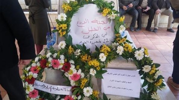 فبدعوة من لجنة الدفاع عن الخليل تجمع حشد من أهالي شهداء مجزرة الحرم الابراهيمي وشهداء الانتفاضة الجارية وحشد من ممثلي المؤسسات الرسمية والشعبية ونشطاء العمل الشعبي والمؤسسات النسوية بضمنهم محافظ محافظة الخليل كامل حميد، وعضوي المجلس البلدي محمد عمران القواسمة وعوني النتشة، وممثل جمعية ابراهيم الخليل في حي تل الرميدة عبد المجيد الخطيب، ورئيسة اتحاد لجان المرأة العاملة عفاف غطاشة وعضو اللجنة المركزية لحزب الشعب الفلسطيني فهمي شاهين في مقبرة الشهداء في حارة الشيخ حيث قرأ الحضور الفاتحة على أرواح الشهداء وألقيت الكلمات بالمناسبة ووضعت أكاليل الزهور على قبور الشهداء باسم المؤسسات والفعاليات المختلفة.