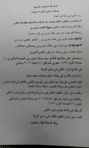 تم تشييع السيدة الفاضلة سهيلة قاسم حزوري (ام احمد ) والدة سفيرفلسطين في كردستان العراق نظمي حزوري وذلك في مأتم حاشد ومهيب في وادي الزينة في اقليم الخروب لبنان بمشاركة قيادة حركة فتح في لبنان وممثلي سفارة فلسطين وقيادات لبنانية وفلسطينية وعربية وحشد من ابناء مخيمات لبنان.