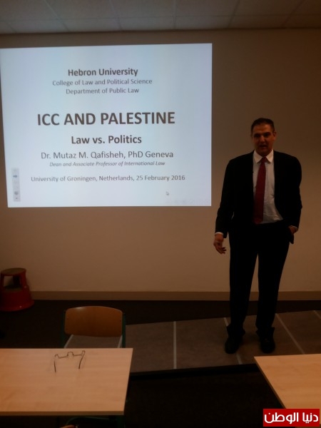 ألقى الدكتور معتز قفيشة، عميد كلية الحقوق والعلوم السياسية وأستاذ القانون الدولي المشارك في جامعة الخليل، محاضرة في كلية الحقوق في جامعة خرونينن (Groningen) التي تقع في شمال مملكة هولندا حول "المحكمة الجنائية الدولية وفلسطين: القانون والسياسة" وذلك بدعوة من البروفيسور مارسيل بروس، أستاذ القانون الدولي في جامعة خرونينن ومسؤول الدراسات في الهيئة العالمية للقانون الدولي (لندن)، والتي يعتبر الدكتور قفيشة أحد أعضائها وذلك بتاريخ 25 شباط/ فبراير 2016. حضر المحاضرة حوالي خمسين من أساتذة القانون الدولي والباحثين