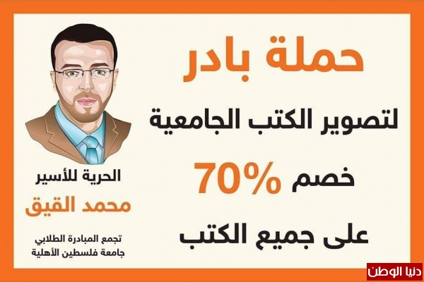 نظم تجمع المبادرة الطلابي في جامعة فلسطين الاهلية حملة تصوير على جميع الكتب الجامعية وبنسبة خصم 70% وتحت عنوان ( الحرية للاسير القيق ... القيق سينتصر على سجانه ). حيث امتد النشاط لمدة اسبوعين متواصلين .