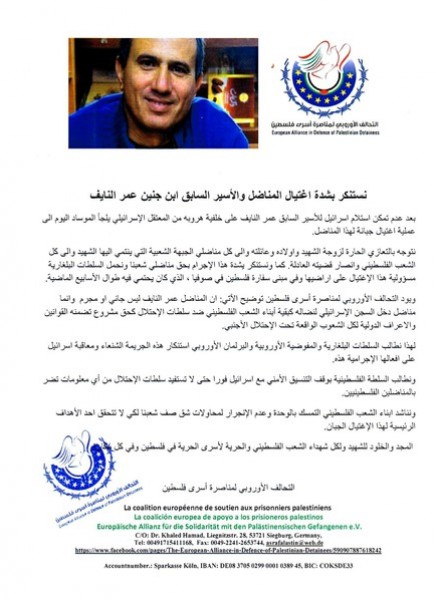 استنكر التحالف الأوروبي لمناصرة أسرى فلسطين اغتيال المناضل والأسير السابق ابن جنين عمر النايف من خلال بيان وصل دنيا الوطن نسخة منه جاء نصه كالتالي: