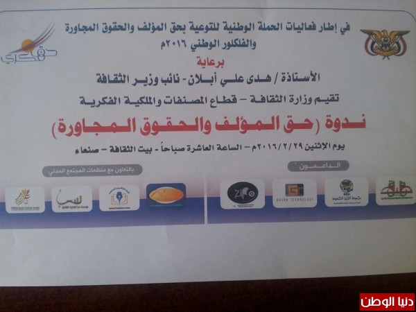 برعاية الأستاذة هدى علي أبلان, نائب وزير الثقافة, تدشن وزارة الثقافة, ممثلة بقطاع المصنفات والملكية الفكرية, يوم غد الاثنين ببيت الثقافة بالعاصمة اليمنية صنعاء الحملة الوطنية للتوعية والتثقيف بحقوق المؤلف والحقوق المجاورة وحماية الفلكلور الوطني 2016, بحضور عدد من المهتمين ورجال الإعلام والصحافة.