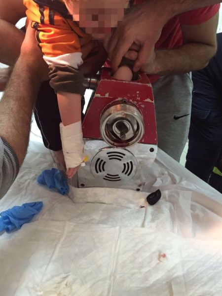 تعرض طفل لتهتك في أصابع يده بعد أن ابتعلت فرامة لحم ثلاثة منها، بسبب عبثه بها، اليوم الجمعة.