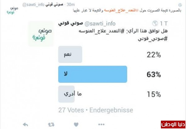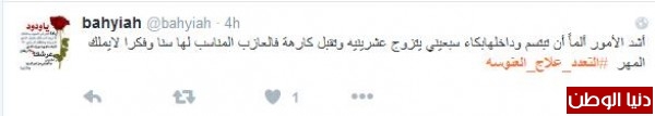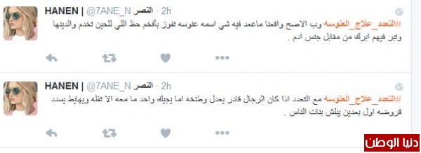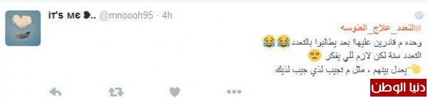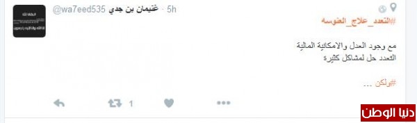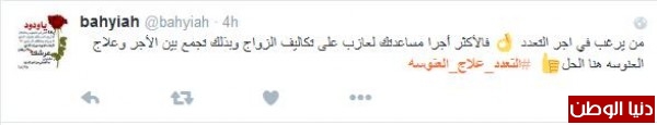 وغرّد أحدهم : "#التعدد_علاج_العنوسه وحده م قادرين عليهاا بعد يطالبوا بالتعدد التعدد سنة لكن لازم للي يفكر يعدل بينهم ، مثل م تجيب لذي جيب لذيك"، وافقه المغرد غنيمان :" #التعدد_علاج_العنوسه مع وجود العدل والامكانية المالية التعدد حل لمشاكل كثيرة"