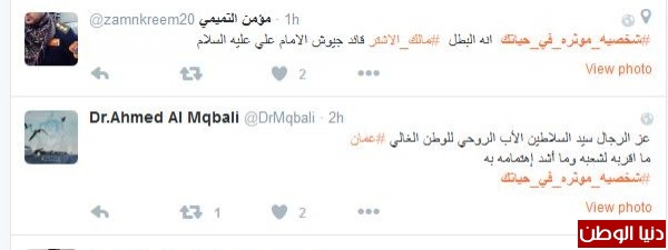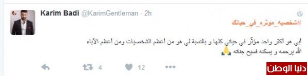 كريم بادي غرّد : "#شخصيه_موثره_في_حياتك أبي هو أكثر واحد مؤثّر في حياتي كلها و بالنسبة لي هو من أعظم الشخصيات ومن أعظم الآباء الله يرحمه و يسكنه فسيح جناته "، أما مؤمن التميمي فغرّد : # "شخصيه_موثره_في_حياتك انه البطل #مالك_الاشتر قائد جيوش الامام علي عليه السلام "