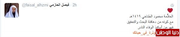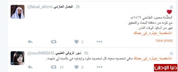 وكان العلامة محمود الطناحي هو الشخصية التي أثرت بالمغرد فيصل الحازمي فقال :" العلاَّمة محمود الطناحي ١٤١٩هـ مع كونه من دهاقنة البحث والتحقيق فهو من أساتيذ الوفاء النادر" ، وغرّدت أخرى :" في كل مجال من مجالات الحياه هناك من أثر في تكوين شخصيتي دينيآ:رسولي الحبيب أجتماعيآ :أبي عاطفيآ :أمي دراسيآ:أختي"