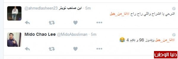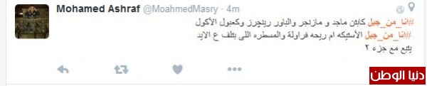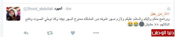 عبدالله غرّد :" وبرنامج منكم واليكم والسلام عليكم ولازم نسهر نشوفه بس المشكله ممنوع السهر ببيتنا وكنا نوطي الصوت ونتابع اشكالهم << حشيش" ، وغرّد محمد سعد :" لعب في التراب لبس الشورت من غير كسوف عبر النيل عوم اشترى عود القصب بخمس قروش".