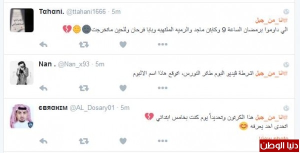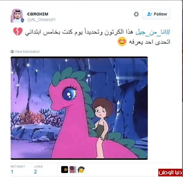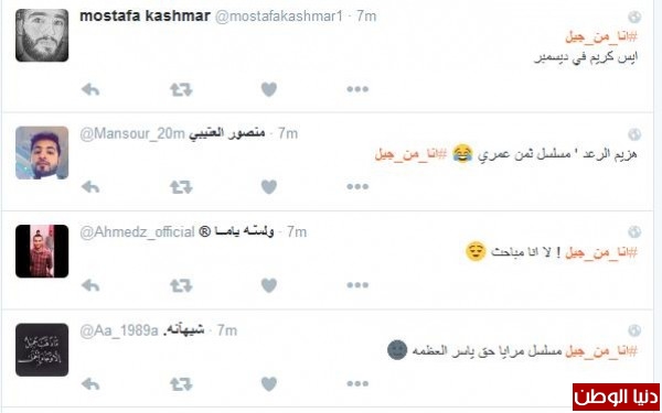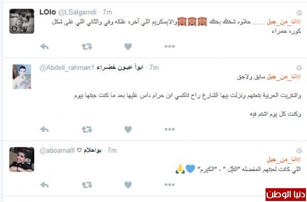 وغرّد آخر : "#انا_من_جيل اشرطة ڤيديو البوم طائر النورس، اتوقع هاذا اسم الالبوم" ، تبعته نورة الحمدان مغردة :" #انا_من_جيل افتح ياسمسم ، ماوكلي ، كونان ، المدرسه الساعه ٩ في رمضان"