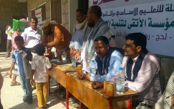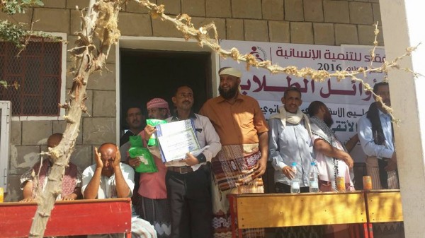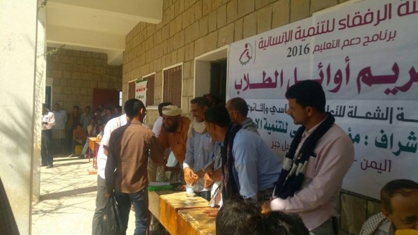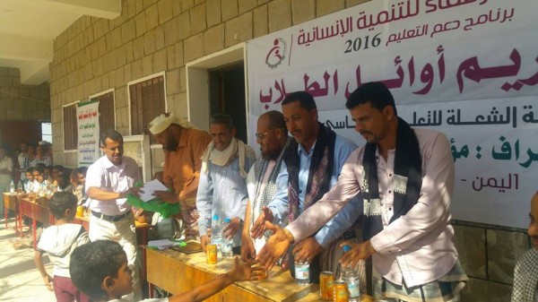 اقامت مدرسة الشعلة للتعليم الاساسي والثانوي بمديرية حبيل جبر محافظة لحج صباح اليوم الاحد حفلاً تكريمياً لأوائل الطلاب/ات المبرزين والمتفوقين في المدرسة للفصل الدراسي الاول للعام 2015-2016م وذلك بالتعاون مع مؤسسة الاتقاء للتنمية الانسانية ودعم مؤسسة الرفقاء للتنمية الانسانية ضمن برنامج دعم التعليم .