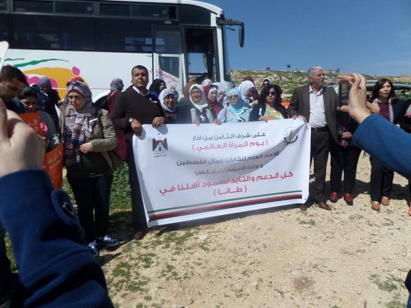 بمناسبة الثامن من آذار ولتثبيت المرأة الفلسطينية في أرضها وتعزيز صمودها نظم الاتحاد العام لنقابات عمال فلسطين اليوم زيارة تضامنية الى خربة طانا في بلدة بيت فوريك شرقي نابلس.