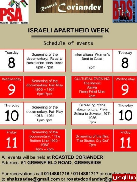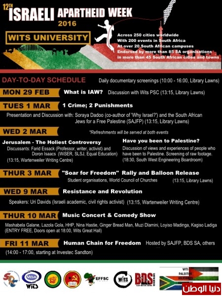 انطلقت يوم امس فعاليات اسبوع مناهضة الابرتهايد الاسرائيلي في جمهورية جنوب افريقيا بمشاركة الحزب الحاكم ANC وحلفاءه التاريخيين في النضال الحزب الشيوعي واتحاد نقابات العمال واكثر من 80 منظمة تضامنية وعلى راسها BDS والائتلاف من اجل فلسطين حرة و تجمع الكنائس (كايروس جنوب افريقيا) و قيادات الجالية الاسلاميه ، حيث يتضمن الاسبوع اكثر من 200 فعالية ستحتضنها مقاطعات ومدن البلاد.