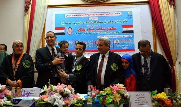 نال الطالب اليمني مهدي محمد حيدر صالح المدرس بكلية الاعلام قسم العلاقات العامة والإعلان جامعة صنعاء من جامعة الازهر بدول مصر العربية درجة الدكتوراه في الصحافة والاعلام مع مرتبة الشرف الاولى مع التوصية بالطباعة والتبادل والتي كانت تحت عنوان :((تأثير الاعلان الصحفي في السلوك الشرائي للجمهور اليمني )) - دراسة تطبيقية وذلك يومنا هذا الخميس الموافق 10مارس 2016م في مدرج الشيخ حمروش بكلية اللغة العربية جامعة الازهر بالقاهرة.