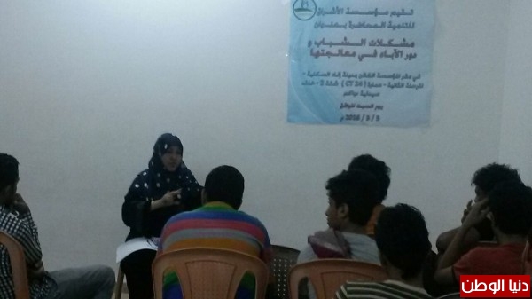 نظمت مؤسسة الاشراق لتنمية محاضرة بعنوان مشاكل الشباب ودور الاسرة بمعالجتها في مقر المؤسسة بمدينة انماء بالعاصمة عدن .قدمتها المحاضرة والاخصائية الاجتماعية والنفسية الاستاذة خديجة بحصو واستهدفت المحاضرة 20 شابا بهدف توعية الشباب بابمشكلات التي تواجههم وكيفية التعامل معها ومعالجتها .