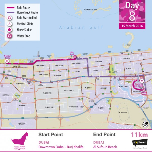 وفيما يخص المسيرة، فستنطلق في تمام الساعة 9:00 صباحاً وبمشاركة فرسان من جنسيات مختلفة، من أمام "داون تاون" دبي - برج خليفة، لتصل في نهاية يومها إلى شاطئ الصفوح بدبي في الساعة 3 عصراً.