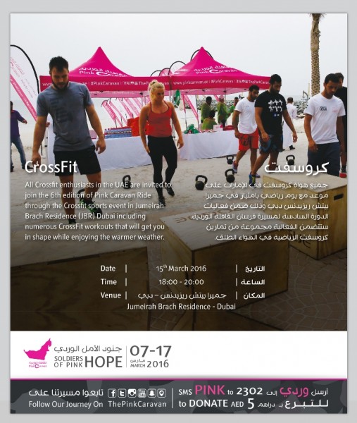 سعياً منها إلى نشر رسالتها التوعوية بين كافة فئات المجتمع، تنظم القافلة الوردية في ثامن أيام مسيرتها السنوية السادسة، سيكون زوار جميرا بيتش ريزيدنس (JBR) بدبي على موعد مع فعالية "الكروس فيت"، التي سيقضي من خلالها هواة هذه الرياضة المشوقة في دولة الإمارات يوماً رياضياً ممتعاً، وستتضمن الفعالية التي ستقام من الساعة 6 - 8 مساءً، مجموعة من تمارين "الكروس فيت" التي ستمارس في الهواء الطلق تحت إشراف نخبة من المدربين.