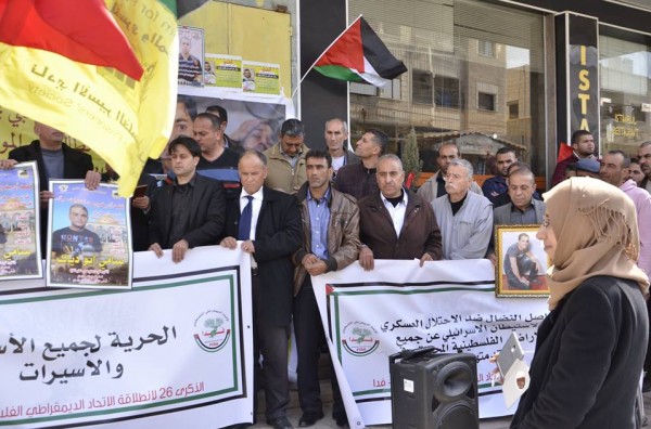 أحيا الاتحاد الديمقراطي الفلسطيني "فدا" في محافظة جنين اليوم الذكرى السادسة والعشرين لانطلاقته بتنظيم اعتصام أمام مقر الصليب الأحمر في المدينة تضامنا مع الأسرى في سجون الاحتلال الإسرائيلي خصوصا الأسرى الأبطال المضربين عن الطعام: محمود الفسفوس وعلاء ريان، وكرم عمرو، وسامي الجنازرة، وتضامنا مع الأسير المريض سامي أبو دياك.