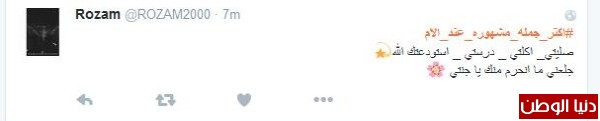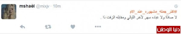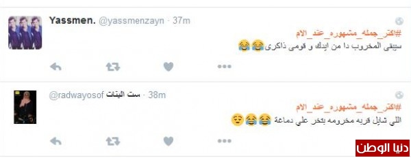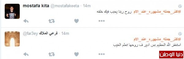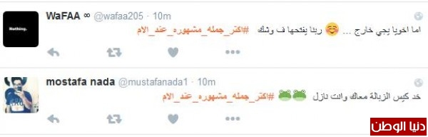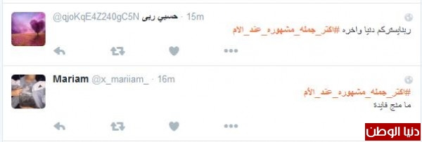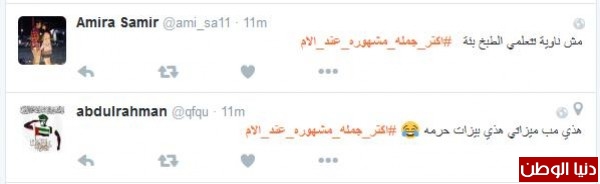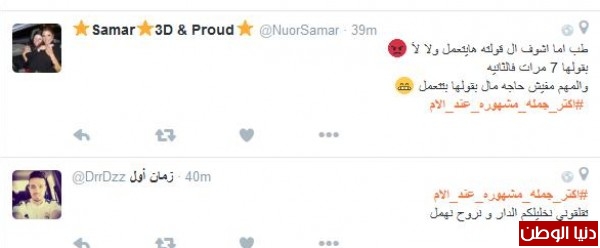 على تويتر دشّن المغرّدون العرب هاشتاج #اكتر_جمله_مشهوره_عند_الام ليتصدّر الترند المحلي لتويتر في عدة مدن عربية وخاصة الترند المصري .