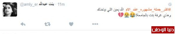 وغرّدت احدى الجامعيات المصريات : "#اكتر_جمله_مشهوره_عند_الام الله يعين اللي بياخذك.. هذي غرفة بنت بالجامعة!" وغرّدت منى : "#اكتر_جمله_مشهوره_عند_الام شوفي بنت فلان وعلان سنعه مب انتي لاشغله ولا مشغله"