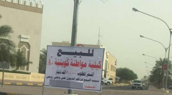 تداول مستخدمو شبكات التواصل الاجتماعي صورة للافتة موضوعة على أرصفة أحد الشوارع بالكويت، تعلن فيها امرأة قيل إنها كويتية عن استعدادها لبيع كليتها لكي تسدد الديون المتراكمة عليها وعلى زوجها.