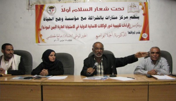 نظم مركز منارات للدراسات التاريخية واستراتيجيات المستقبل بصنعاء يوم الثلاثاء الموافق 15 مارس 2016م ، ندوة فكرية تحت شعار "السلام أولاً" في إطار موسم منارات المكرس لمناقشة الوضع الإنساني في اليمن وجهود الاستجابة الطارئة ، بعنوان: "قراءات تقييمية لجهود الاستجابة الانسانية الدولية في اليمن" .