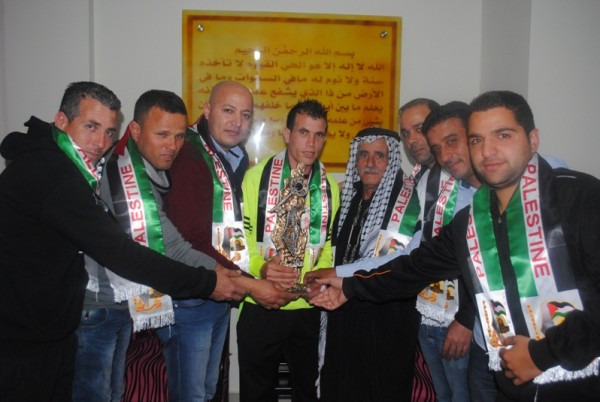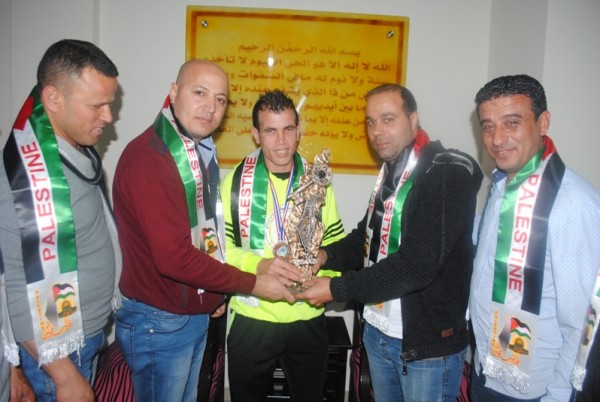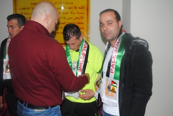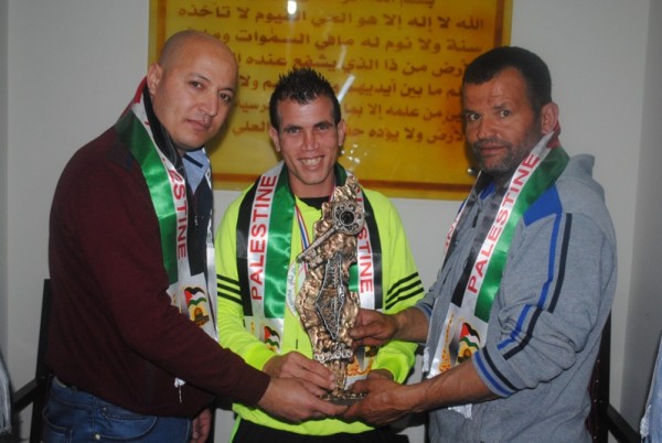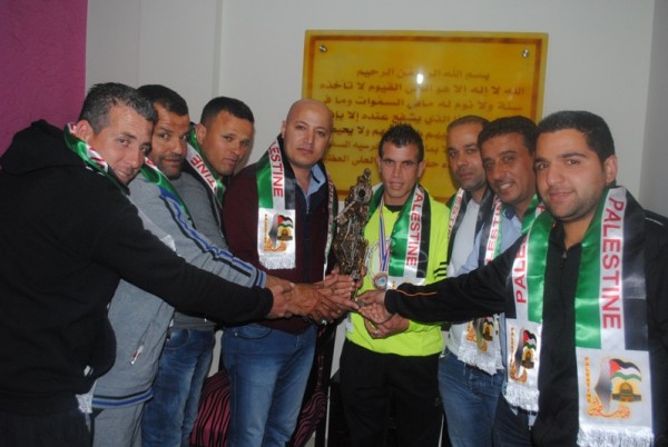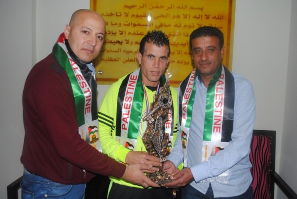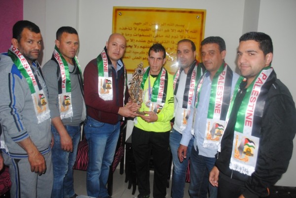 تقدم الوفد مسؤول التجمع الاستاذ وسام موسى،على رأس عدد من اعضاء التجمع، حيث قاموا بتقديم درع خارطه فلسطين للبطل وتهنئته على ما قدمه للرياضه الفلسطينية.