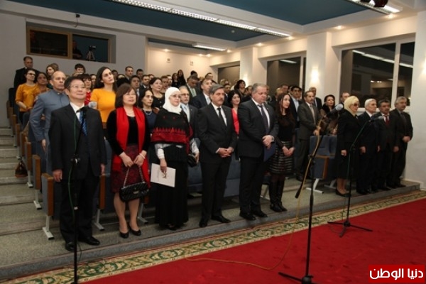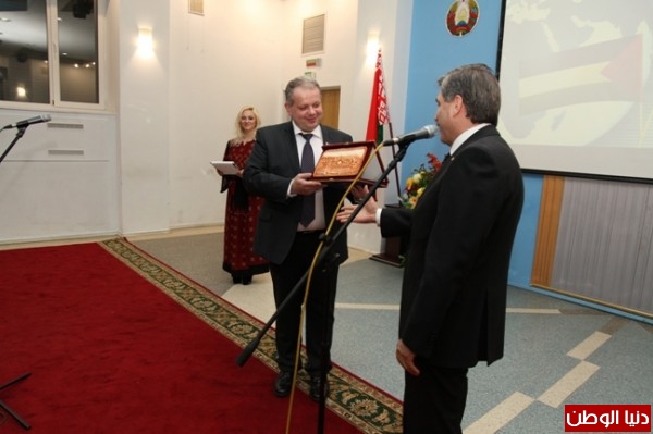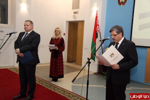 وافتتح الاحتفال بالنشيدين الوطنيين الفلسطيني والبيلاروسي ، تلاها كلمة سفير دولة فلسطين خالد عريقات والتي بدأها بالترحيب والشكر لكل من ساهم وشارك في هذا الحفل .