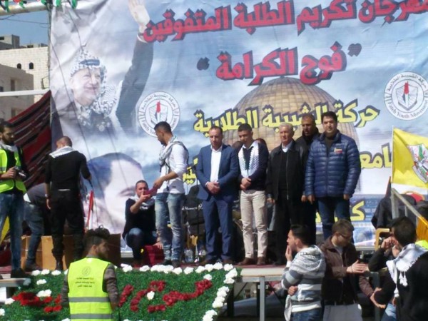 نظمت حركة الشبيبة الطلابية في جامعة بوليتكنك فلسطين "كتلة شهداء الأقصى "اليوم مهرجاناً لتكريم الطلبة المتفوقين تحت عنوان " فوج الكرامة ،وإحياءً لذكرى معركة الكرامة ، بحضور عضو اللجنة المركزية لحركة فتح عباس زكي ،وأمين سر إقليم وسط الخليل عماد خرواط ،وأعضاء الإقليم ،والعقيد سفيان المحتسب ، وأعضاء مجلس الأمناء، ورئيس الجامعة عماد الخطيب، ونواب الرئيس وعمداء الكليات ولفيف من هيئتي الجامعة الأكاديمية والإدارية، وذوي الطلبة، وذوي الشهيد الطالب عبد الله محمد عايد العجلوني .