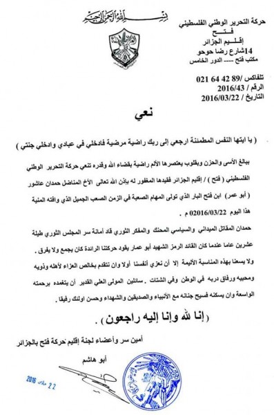 بمزيد من الحزن والأسى وبقلوب يعتصرها الألم راضية بقضاء الله وقدرة تنعى حركة التحرير الوطني الفلسطيني (فتح) إقليم الجزائر فقيدها المغفور له بإذن الله تعالى الأخ المناضل حمدان عاشور (ابو عمر) أبن فتح البار الذى تولى المهام الصعبة فى الزمن الصعب الجميل الذى وافته المنية صباح يوم الاثنين الموافق 22-03-2016