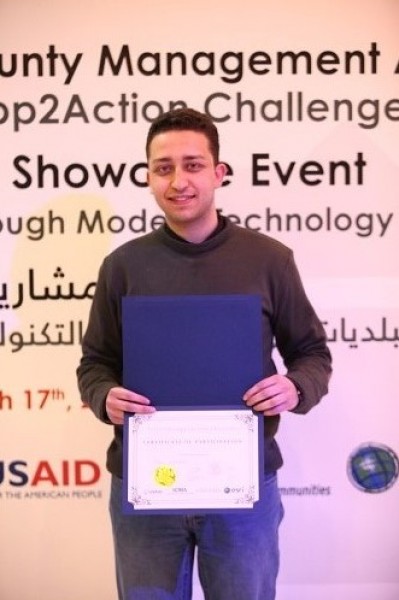 وفاز بالمركز الأول وجائزة قيمتها 5000 دولار تطبيق نظام التقارير (Reporting System App) والذي طوره كل من راضي برق وأحمد عامر. وعالج التطبيق تحدي أتمتة نظم الاتصال والتواصل بين البلدية والجمهور في مجال الابلاغ عن المشاكل في خدمات وتوزيع المياه وتحليلها ومتابعتها من قبل البلدية والجمهور. وجاء في المركز الثاني تطبيق مراقبة المياه (Water Eye) لكل من: أحمد أبو عمر ومي عوايص وايهاب حجة وناجي كراجة، وحصلوا على جائزة قيمتها 2500 دولار. وعالج التطبيق تحدي زيادة الكفاءة في عملية توزيع المياه. وحصل على المركز الثالث تطبيق لتحديد مواقع الصيانة للعملاء (Locator, Maintenance Customer App) لكل من: محمد السايح، معين عنبتاوي واحمد ارشيد، وفازوا برحلة الى ولاية كاليفورنيا الأمريكية للمشاركة في مؤتمر شركة اسري. وعالج التطبيق تحدي أتمتة نظم الاتصال والتواصل بين البلدية والجمهور باستخدام نظام تحديد المواقع بالاضافة الى تحدي تحفيز تسديد فواتير خدمات المياه في الوقت المحدد حيث يمكن للمستخدم تسديد فواتيره من المنزل. وتميز هذا التطبيق لاستخدامه نظام ESRI ومعالجته عددا من التحديات معا.