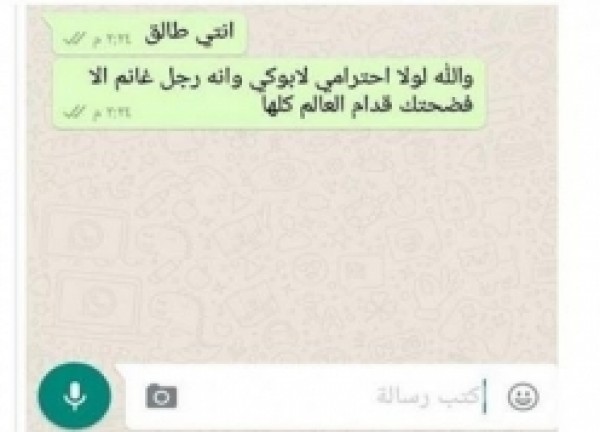 ونشر الزوج رسالة الدردشة على تطبيق الواتس آب ، داعياً الزوجات عدم العناد مع ازواجهم، ومؤكدأ انه ليس نادم على قرار تطليقها، مشيراً انه من سكان العاصمة عمان، ومتزوج من خمسة اعوام .