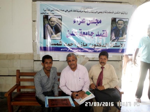أقامت جامعة عدن صباح اليوم الأحد (28 مارس 2016م)، مراسم تقبل العزاء بوفاة المغفور له بإذن الله الدكتور/مازن أحمد عبدالله شمسان عميد كلية الاداب.