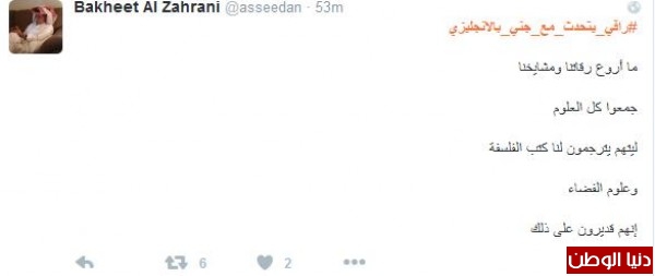 أحد المغرّدين، حكيم من السعودية غرّد : "#راقي_يتحدث_مع_جني_بالانجليزي بصراحه حسيت ان الجني معاه اسهال ويبي يروح الحمام"، أما راس عرقوب فغرّدت : "هذي نتيجه التغريب حتى الجن يتكلمون بلغة الكفار #راقي_يتحدث_مع_جني_بالانجليزي".