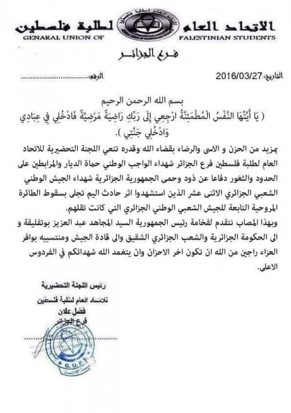 تقدم رئيس وأعضاء اللجنة التحضيرية للاتحاد العام لطلبة فلسطين فرع الجزائر بأصدق التعازي والمواساة للجزائر وشعبها وحكومتها وجيشها الشعبي الوطني وقيادته الوطنية بسقوط 12 شهيدا مساء يوم السبت الموافق 27-03-2016 اثر سقوط حوامة تابعة للجيش الجزائري بمنطقة رقان بالصحراء الجزائرية راجيين من الله العلي القدير ان يتغمد الشهداء بوافر رحمته وان يسكنهم فسيح جناته و ان يشفي الجنديين المصابين
