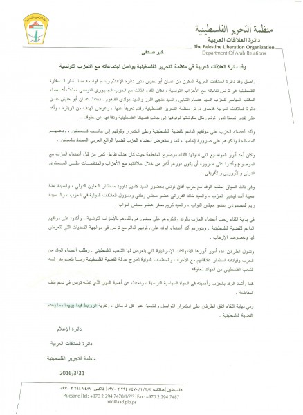 وفد دائرة العلاقات العربية في منظمة التحرير الفلسطينية يواصل اجتماعاته مع الأحزاب التونسية