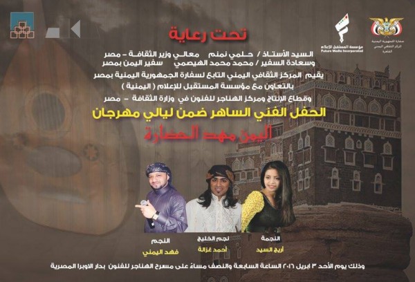 يقيم المركز الثقافي اليمني بالسفارة اليمنية بجمهورية مصر العربية الأحد القادم الحفل الفني الساهر ضمن ليالي مهرجان " اليمن مهد الحضارة " بالتعاون مع مؤسسة المستقبل للإعلام اليمنية وقطاع الأنتاج ومركز الهناجر للفنون في وزارة الثقافة المصرية ؛ ويحيي الحفل كلاًً من النجمة آريج السيد، ونجم الخليج أحمد غزالة والنجم فهد اليمني .