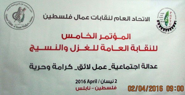 عقدت النقابة العامة لعمال الغزل والنسيج والخياطة الفلسطينية، اليوم السبت، في المقر المركزي للاتحاد العام لنقابات عمال فلسطين في مدينة نابلس، مؤتمرها العام الخامس وانتخبت مجلسا تنفيذيا ورئيسا لها للدورة النقابية 2016-2020 .