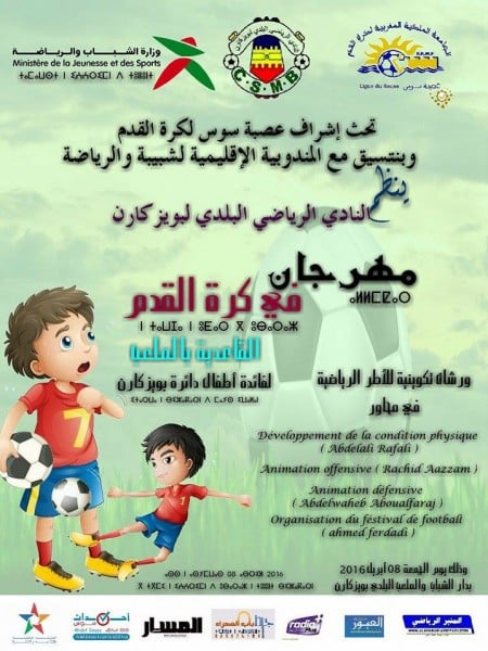 في إطار أنشطته السنوية يعتزم النادي الرياضي البلدي لبويزكارن تنظيم مهرجان في "كرة القدم القاعدية لفائدة أطفال دائرة بويزكارن"، تحث إشراف عصبة سوس لكرة القدم وبتنسيق مع المندوبية الإقليمية لوزارة الشباب والرياضة ودلك يوم 08 أبريل 2016، بكل من دار الشباب بويزكارن والملعب البلدي لبويزكارن.