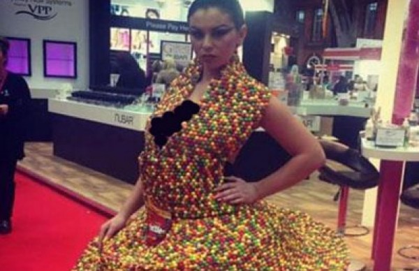 التصميم الذي حظي بإعجاب دور الأزياء العالمية كان مصنوعاً من 3000 من كرات، حيث استخدمت براين 145 علبة من الكرات الصغيرة تم لصقها بـ 90 أنبوبة من الصمغ.