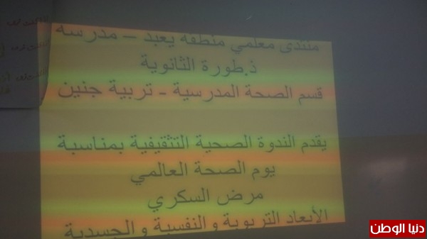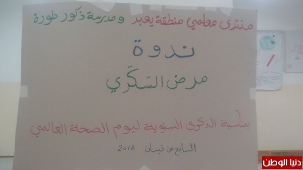 نفذ منتدى معلمي منطقة يعبد – احدى مبادرات مركز القطان للبحث والتطوير – بالتعاون مع مدرسة ذكور طورة وقسم الصحة المدرسية في مديرية التربية والتعليم – جنين ، ندوة تثقيفية حول مرض السّكري ، في يوم الصحة العالمي السابع من نيسان ، للأمهات وطلاب الصف العاشر من مدرستي ذكور طورة وبنات طورة.