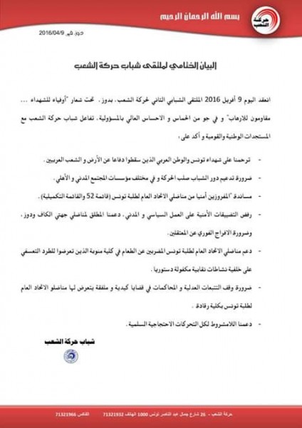 - رفض التضييقات الأمنية على العمل السياسي و المدني، دعمنا المطلق لمناضلي جهتي الكاف ودوز، وضرورة الافراج الفوري عن المعتقلين.