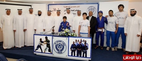 واستهل عبد الرحمن أبو الشوارب المؤتمر الصحافي بكلمة ترحيبية بالحاضيرن وتقدم بالشكر إلى موسوعة "دبي أيقونة العالم" على رعايتها لفريق الجوجيتسو، مشيرا إلى أن النصر يتشرف برعاية الموسوعة للفريق وبحمل شعارها في بطولةالعالم، وقال: " بهذه المناسبة نجدد شكرنا لسمو الشيخ حمدان بن راشد آلمكتوم نائب حاكم دبي وزير المالية رئيس النادي، على ثقة سموه بمجلس الإدارة الجديد لشركة النصر للألعاب الجماعية والفردية، كما نشكر سمو الشيخ راشد بن حمدان بن راشد آل مكتوم رئيس مجلس إدارة النصر."