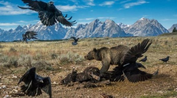 قضى مصور محترف 5 أشهر، التقط خلالها 200 ألف صورة ليحصل على الأفضل بينها، لمشهد مطاردة بين الدب الأشيب والغربان وخلفها منظر الجبال، داخل متنزه غراند تيتون الوطني بالولايات المتحدة.