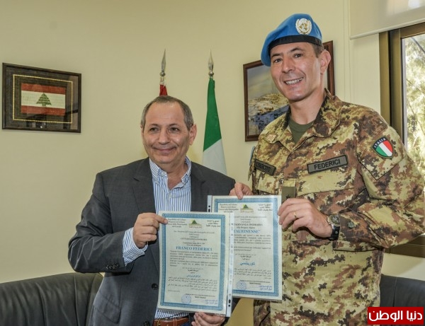 منح رئيس إتحاد بلديات القلعة في جنوب لبنان نبيل فوازقائد القطاع الغربي لليونيفيل الجنرال الإيطاليفرانكو فيديريتشيواللواء "آلبينا تاوريننسي" شهادة المواطنة الفخرية تقديراّ لمشاركتهم في مهمة اليونيفيل وللمساهمة القيمة في سبيل الأمن والإستقرار والسلام في جنوب لبنان .