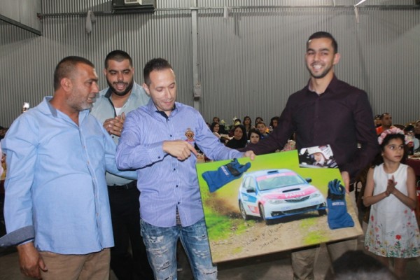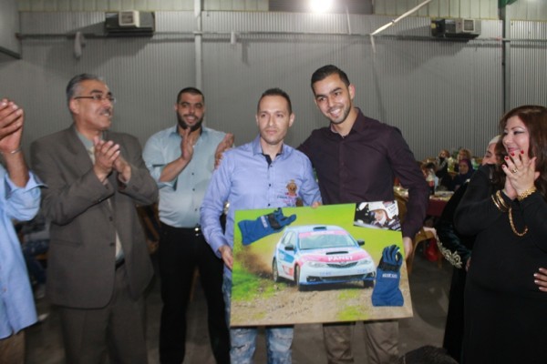 حيث احضر سائق الرالي له هدية صورة كبيرة وعليها الصق فادي "القفازات" التي قاد بها اول سباق في حياته قبل اكثر من 13 سنة .