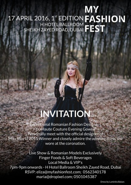 تنطلق غدا الاحد 17 ابريل الجاري عروض "ماي فاشن فيست" الاولى من نوعها في تمام الساعة 7:00 مساءً في فندق "H Hotel" (صالة الحفلات، شارع الشيخ زايد)، وستضمّ أحدث صيحات الأزياء التي أبدعتها أنامل مصممات أزياء رومانيات.